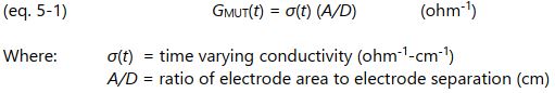 Conductance is a bulk property that depends on the amount of Material Under Test, the geometry of the electrodes and the conductivity of the material between them. Like density, conductivity is a property that is independent of the quantity of material and how it is measured. During cure this conductivity changes with time, and the measured bulk conductance as a function of time, G MUT ( t ), is given by equation 5-1.