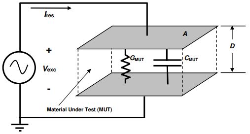 Figure 5-2 shows a model of the conductance and capacitance of a material under test (MUT) between parallel plate electrodes. Note that only conductance is relevant in this section.