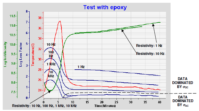 During the early part of cure, when a thermoset is most conductive, σ DC tends to dominate the dielectric response across a broad range of frequencies. At sufficiently low frequencies σ DC may also be the significant component through the entire cure. When σ DC dominates cure behavior, σ AC is insignificant and loss factor may be approximated as: