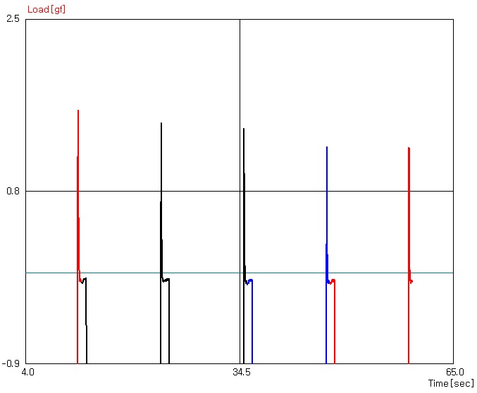 1mm/sec 의 상승속도로 시험한 포스트잇의 tack 시험 결과