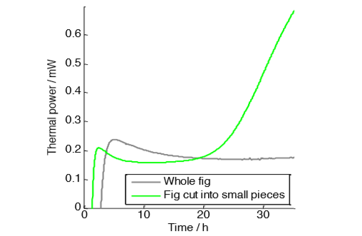 In a Biocal 2000 calorimeter at 23 °C, one sample channel contained a whole fresh fig (37.5 g), while the other channel contained a similar fresh fig (34.5 g) cut in 10 mm pieces.