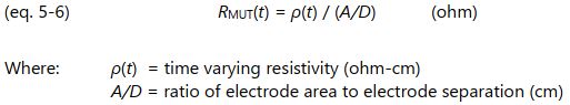 The bulk property of resistance ( R ) is related to the material property of resistivity ( ρ ) by a scaling factor or cell constant. For the parallel plate configuration of Figure 5-2 this scaling factor is the ratio of plate area A to plate distance D , or A/D . For planar interdigitated electrodes, this scaling factor is still called the A/D ratio even though area and distance are not as apparent.  As with conductivity, resistivity changes with time during cure, and the measured bulk resistance as a function of time, R MUT (t), is given by equation 5-6.