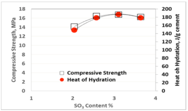 As can be seen from Figures 3-5, there is an excellent correlation between the optimum SO3 content determined using compressive strength and heat of hydration methods, as originally published by Lerch in 1946. Similar results have been obtained for two and three days Heat of Hydration and compressive strength, respectively.