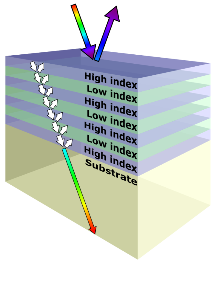 Differences in refractive indices between the substrate and thin-film coatings or two dissimilar thin-film coatings results in the reflection of light at the boundary. This effect is manipulated to give anti-reflection coatings and dichroic mirrors.