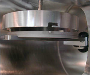 For angled sputtering configurations with rotating substrates, AJA International Inc. sputtering sources can be fitted with the “in-situ tilt” option. This option, shown at the left, allows the source angle to be precisely adjusted from outside the vacuum chamber. Fine tuning the incident angle is critical to achieving good deposition uniformity when working distances, operating pressures and materials are changed. When fixed angle arrangements limit and often compromise the capabilities of a system, “in-situ tilt” can deliver better than ± 2% uniformity on substrates which can be up to triple the diameter of the source targets.
