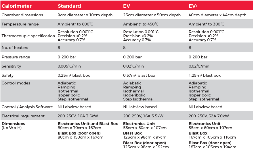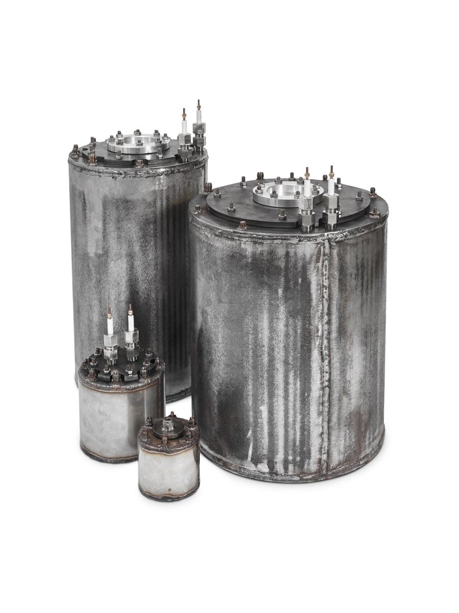 The EV+ is an cylindrical calorimeter 40cm in diameter and 44cm depth. Unlike other THT adiabatic calorimeters the lid seals to the base unit. This seal is restricted to below 1 bar and is maintained by electromagnets. This allows for inertion of the environment and the ability to collect products of battery disintegration.