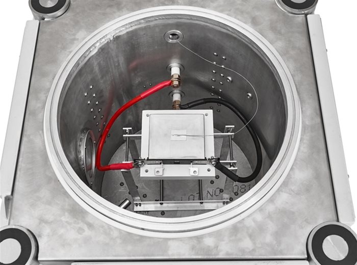 Many prescribed ‘standard’ tests call for Calorimetry and also call for use of abuse testing (eg SAND, SAE). Tests call for video monitoring, gas detection/analysis, nail penetration and crush under controlled conditions. The EV+ calorimeter from THT has been designed to accommodate many of these tests - and more whilst gaining quality information on heat release. The EV+ is an cylindrical calorimeter 40cm in diameter and 44cm depth. Unlike other THT adiabatic calorimeters the lid seals to the base unit. This seal is restricted to below 1 bar and is maintained by electromagnets. This allows for inertion of the environment and the ability to collect products of battery disintegration.