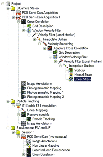 The user builds an analytical tree by choosing combinations of nodes to process (ex: cross correlation, particle tracking), then to filter, and to reprocess (ex: adaptive correlation), before post-processing and extraction operations. data.